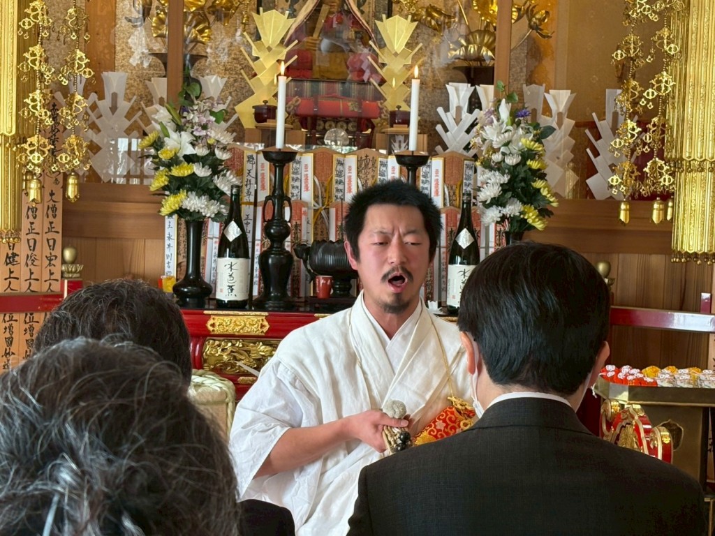 参拝者で一杯になった本堂内にオーラを放つ導師上人の大音声が響き渡り、御修行の一端を垣間見させて頂きました。読経、奉告文の読み上げ、唱題行に続き、御修行僧が木剣を打ち鳴らし、祈祷肝門を唱え、撰経を参拝者の身体に当てての御加持祈祷は、必ずや皆様にご加護が頂けるものと確信致しております。
